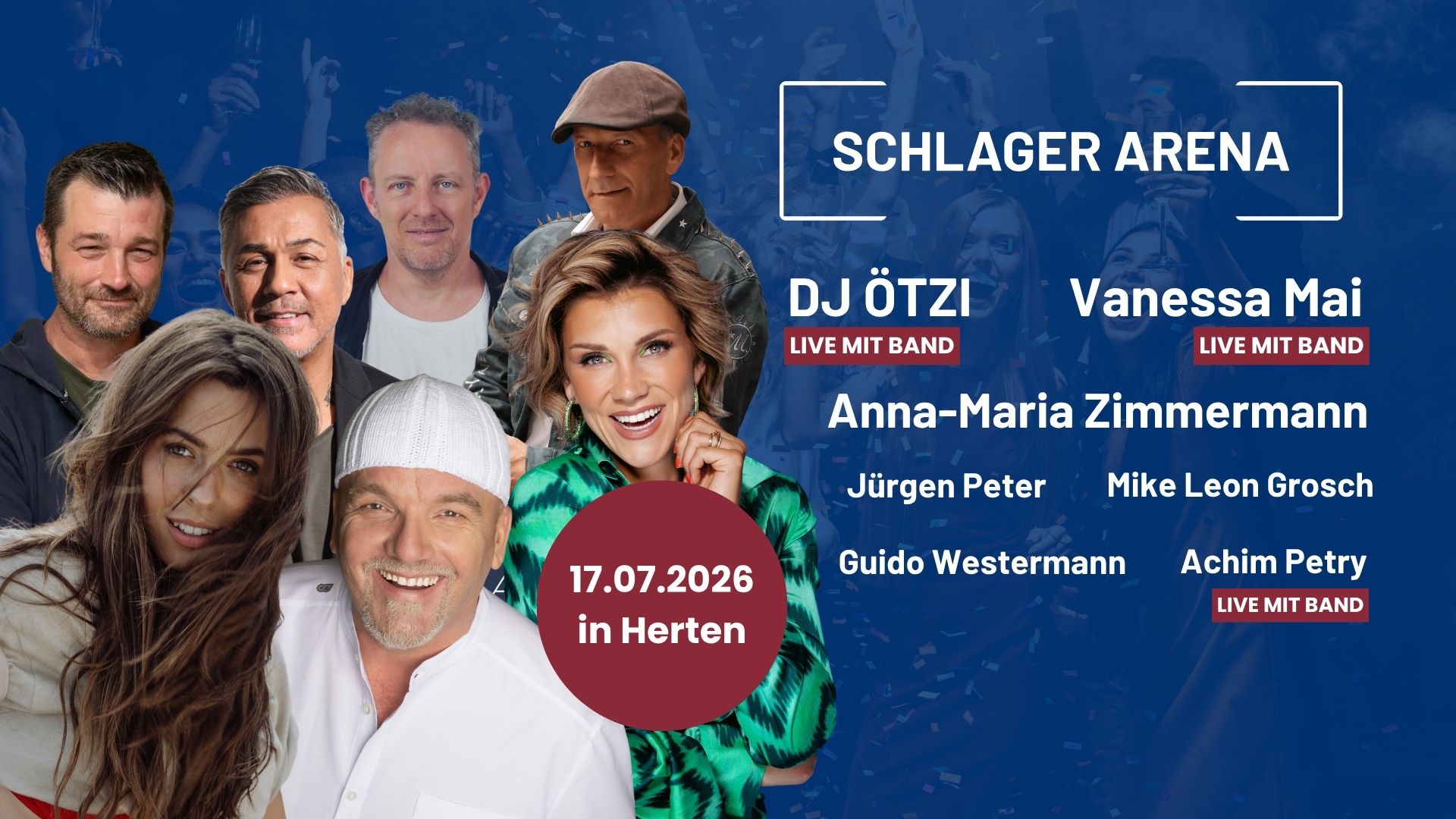 Am 17. Juli 2026 wird die Arena auf Ewald zum Hotspot für alle Schlagerfans! Erlebt ein unvergessliches Open-Air-Event mit Vanessa Mai, DJ Ötzi & Band, Mike Leon Grosch, Achim Petry mit Band und Anna-Maria Zimmermann.